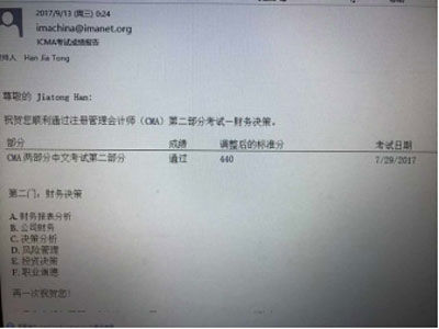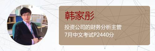 韩家彤是上海一家投资公司的财务分析员,他在7月份的中文考试考出了P2科目440分的好成绩。因为本身就是做财务分析工作,管理会计CMA证书是他一直想要考的。在备考CMA的过程中,他学到更多的管理会计知识,更好的运用在平时的工作中。